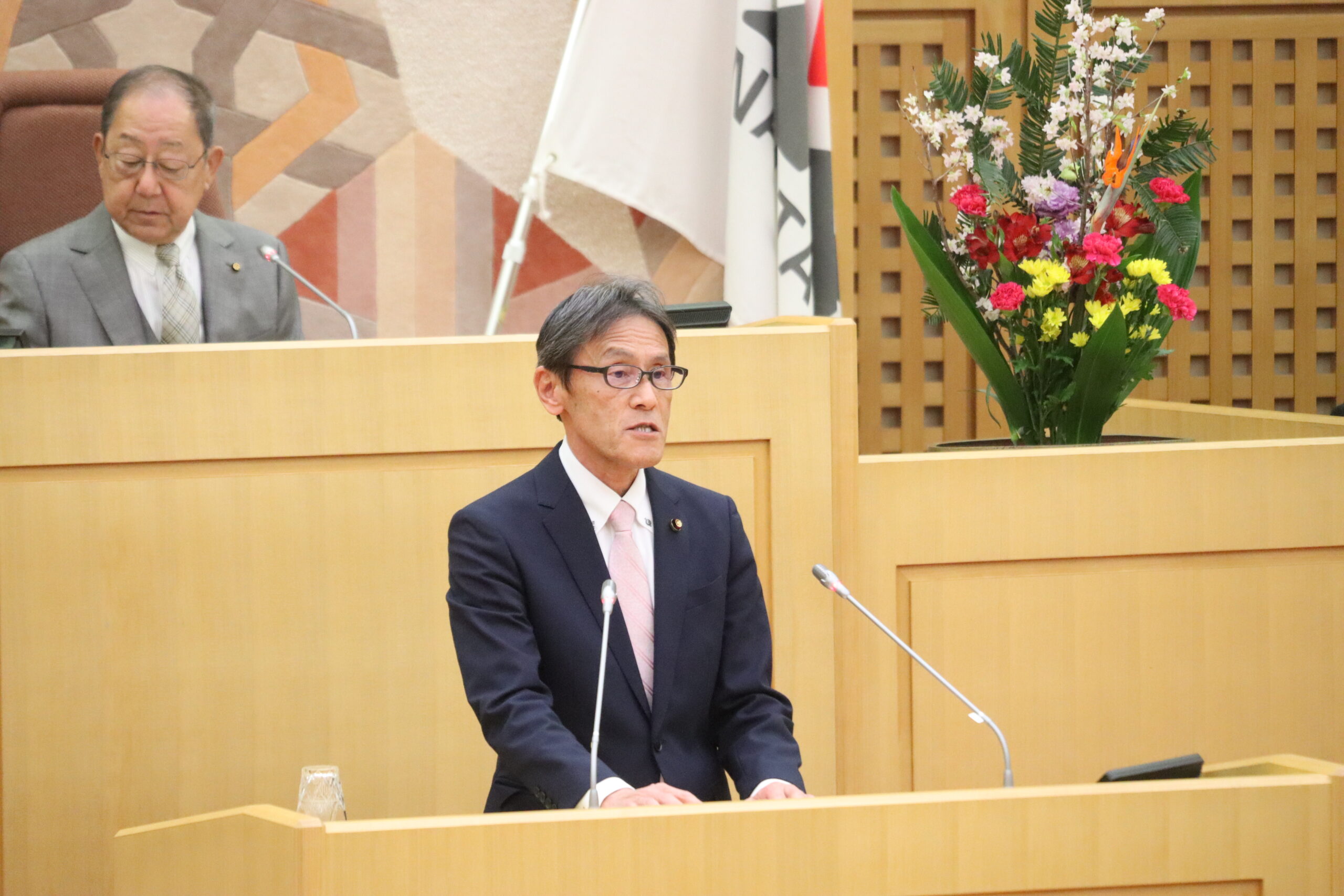 役職定年を迎えられた部長の皆さんに、議場で花束贈呈が行われました。